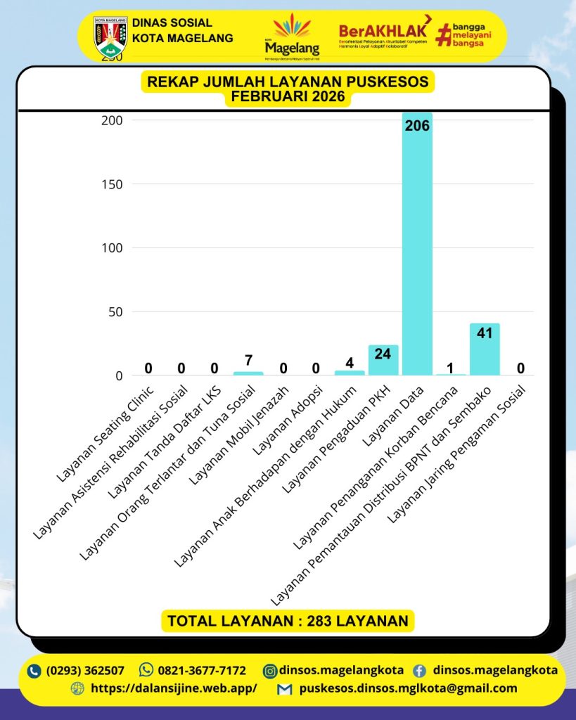 Pusat Kesejahteraan Sosial (PUSKESOS) selama bulan Februari 2026 mencatat 283 layanan yang telah diberikan kepada masyarakat. Layanan tersebut merupakan bagian dari upaya pemerintah daerah dalam meningkatkan akses masyarakat terhadap pelayanan kesejahteraan sosial secara cepat, terpadu, dan responsif.